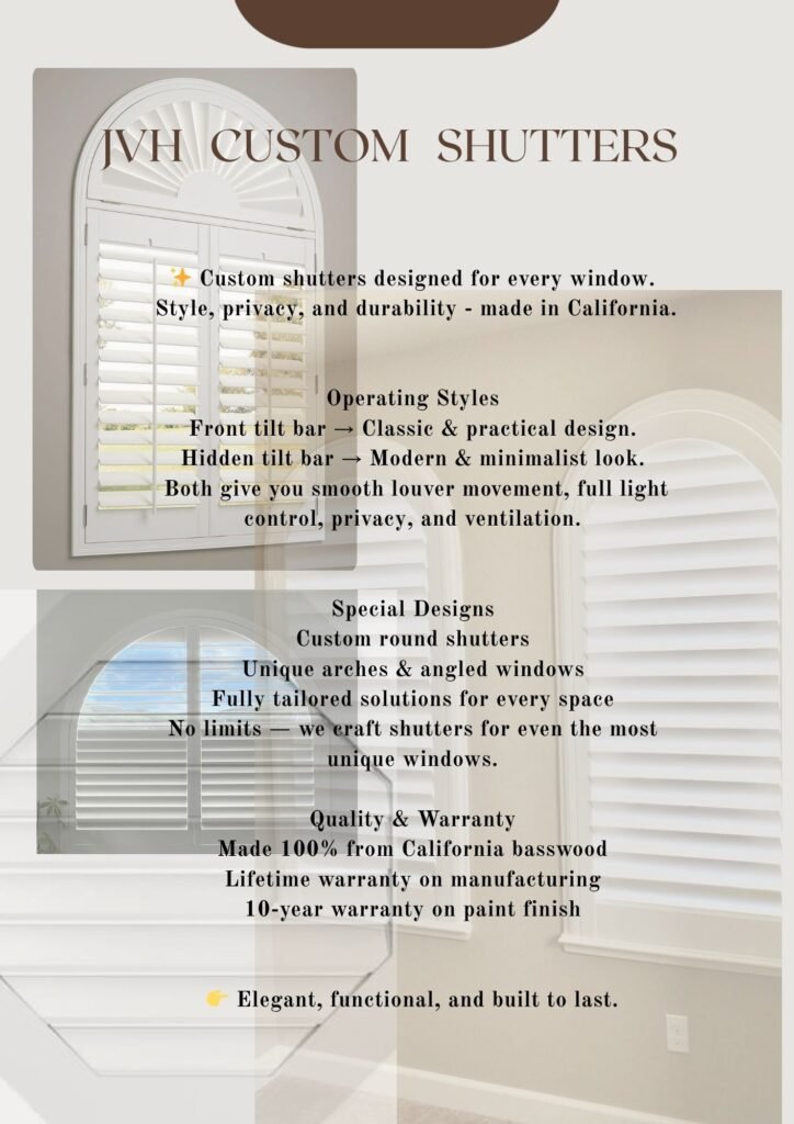 At JVH Custom Shutters, we believe your windows deserve more than just a covering—they deserve a touch of elegance and comfort that transforms your entire home. Since 2012, we’ve been crafting beautiful, made-to-measure shutters that bring style, privacy, and functionality together in perfect harmony.